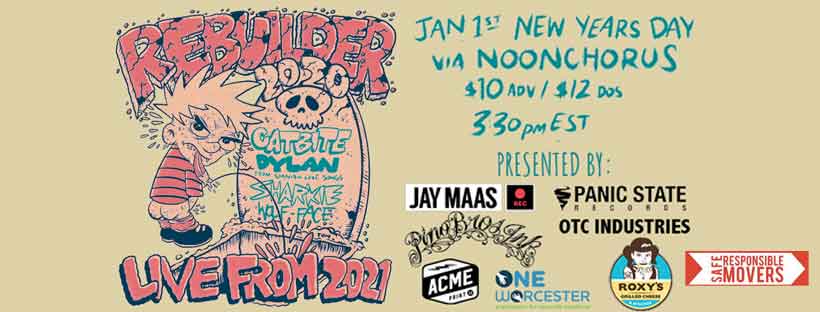 Ring in the New Year with a Hangover-friendly stream from Rebuilder on January 1st with Catbite, Wolf-Face, Dylan from Spanish Love Songs, Sharkie and Matt Spence. 3:30pm.